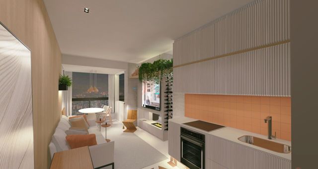Cozinha planejada moderna com geladeira, cooktop de indu;áo e forno integrada à sala.