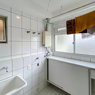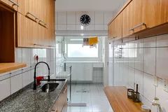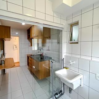 A cozinha é planejada e rica em armários, integrada à área de serviço de ótimo tamanho e ventilaçaqo natural.