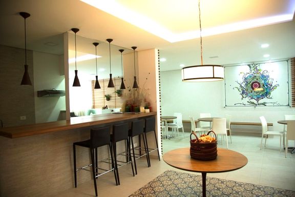 Cozinha americana planejada com bancada.