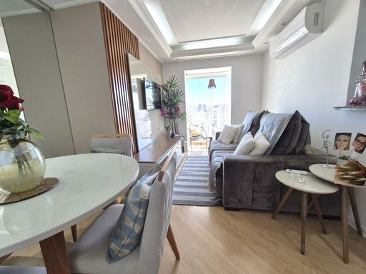 A sala para 2 ambientes com ar condicionado possui decoração moderna, está ligada a agrdável sacada.