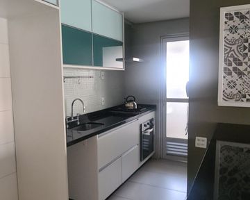 Possui 82m² muito bem distribuídos, sala para dois ambientes integrada à cozinha, varanda gourmet com a churrasqueira a carvão.