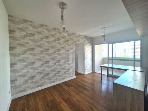 Apartamento com 2 dormitórios com armários planejados sendo uma suíte, sala para 2 ambientes com sacada envidraçada, piso vinílico, 63m², cozinha planejada rica em armários em excelente estado, área de serviço ampla separada da cozinha.