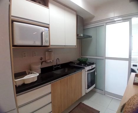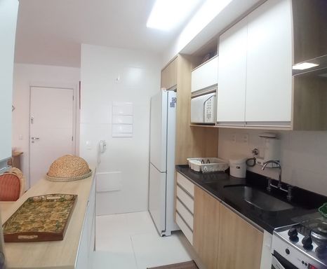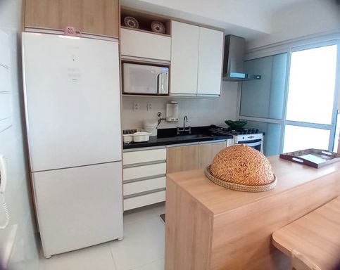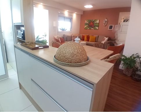 A cozinha americana planejada se integra de forma harmônica ao living, trazendo praticidade e um toque moderno para o dia a dia.