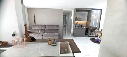 A sala para 2 ambientes está ampliada e integrada à cozinha.