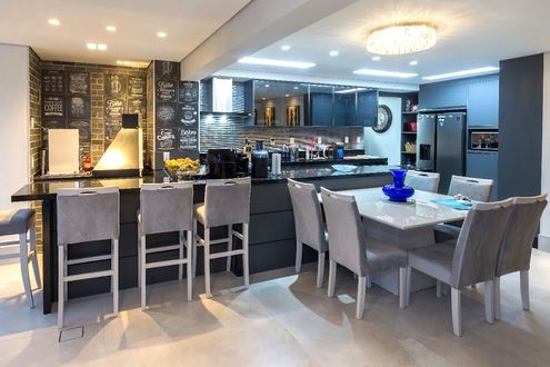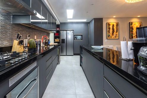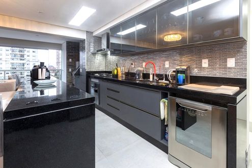 Cozinha gourmet moderna e equipada, integrada `a sala e a varanda.